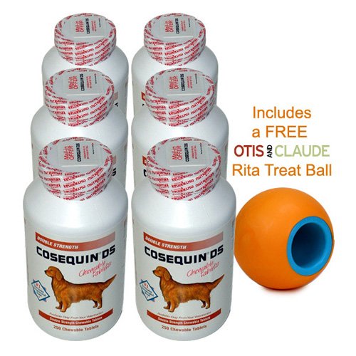 Buy the 6 Pack of Cosequin DS for maximum saving and FREE shipping AND one FREE Otis and Claude Rita Ball. 3-PACK Cosequin DS Capsules 250 Count (750 ct) for Dogs, is a nutritional supplement that helps dogs maintain healthy joints. It has been rated the number one veterinarian-recommended joint health supplement brand. Cosequin's active ingredients include glucosamine and chondroitin, and it can have a positive impact on joint health, while avoiding the side effects that can sometimes accompany prescription drugs. Administration: The usual starting dose for the first 4 to 6 weeks for dogs 10-24 lbs is 1 capsule daily, for dogs 25-49 lbs is 1 capsule twice a day, for dogs 50-100 lbs give 2 capsules in the morning and 1 capsule in the evening, and for dogs over 100 lbs give 2 capsules twice a day, After 4 to 6 weeks, the dose can be reduced gradually (1/2 to 1 capsule per month) until a maintenance dose, one-half the starting dose, is reached Ingredients: Glucosamine hydrochloride (derived from shellfish), sodium chondroitin sulfate (derived from bovine cartilage), gelatin, manganese ascorbate, water, mixed glycosaminoglycans, magnesium stearate, and sodium lauryl sulfate, FD&C blue #1, and FD&C yellow #5. Guaranteed Analysis: (Per Capsule) Glucosamine HCL min. 500 mg Sodium Chondroitin Sulfate min. 400 mg Manganese (Ascorbate) min. 5 mg Effective alternative available for only $329.99 (1500 Tablets)-->