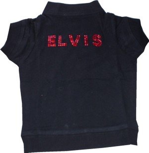 From the Elvis Presley Hound Dog Collection. This Black Tee features the name "Elvis" in red rhinestones.